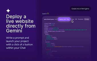 Publish Google Gemini Code by Tiiny Host es una extensión para Chrome que permite desplegar de manera instantánea el código generado por Google Gemini en Internet. Esta herramienta facilita la publicación de sitios web, juegos y aplicaciones, proporcionando un enlace compartible en cuestión de segundos. Con más de un millón de usuarios en todo el mundo, Tiiny Host se presenta como una solución accesible para alojar y compartir proyectos en línea, sin necesidad de conocimientos técnicos avanzados.